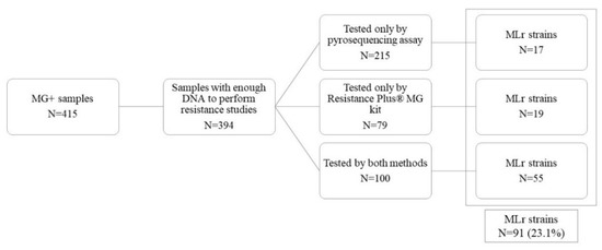 Among the 415 MG-positive samples detected by Allplex STI-7, 21 contained insufficient DNA to perform the resistance study, leaving a total of 394 specimens. Macrolide resistance analysis was performed by two different methods: pyrosequencing, ResistancePlus® MG kit, or by both methods. A subset of 100 samples was analyzed by both methods, whereas additional 215 samples were processed by pyrosequencing only and 79 more by ResistancePlus® MG kit only. The prevalence of macrolide resistance was 23.1%, with a total of 91 samples harboring macrolide resistance-associated mutations. More details are shown in Figure 2.