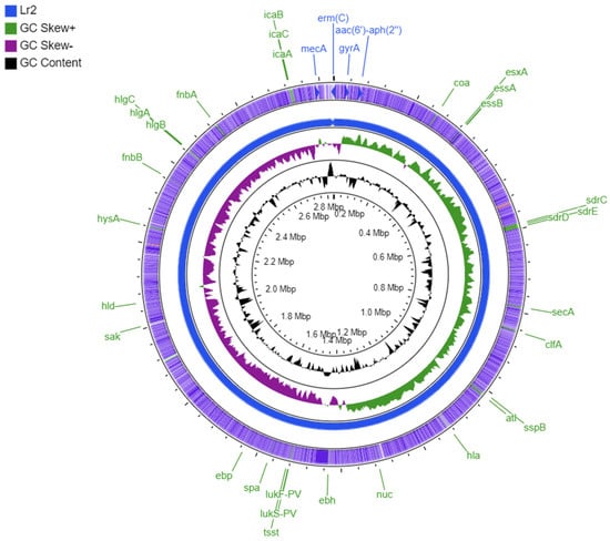 The genome of Lr2 carries toxin associated genes, particularly alpha-hemolysin gene (hla), gamma hemolysin (hlgA, hlgB, and hlgC), delta hemolysin gene (hld), exotoxins (set10, set13, set15, and set16), enterotoxin-like O (selo), exotoxins (set1, set2, set4, set7, set10, set13, set15, and set16), enterotoxin-like M (selm), enterotoxin-like N (seln), enterotoxin B (seg), PVL (lukF-PV and lukS-PV), and TSST (tsst-1). However, beta-hemolysin gene (hlb), exfoliative toxin type A (eta), enterotoxin A (sea), enterotoxin Yent1 (yent1), enterotoxin-like K (selk), exotoxins (set34, set37, and set39), and leukotoxins (lukM, lukD, and lukE) were found absent (Figure 1).