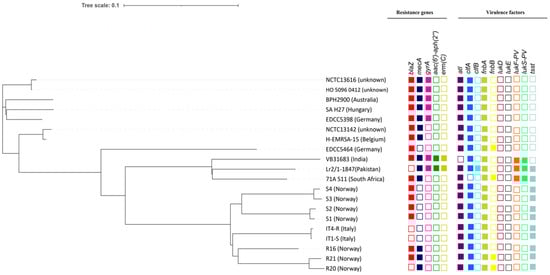 The whole-genome SNPs phylogenetic analysis of MRSA Lr2 ST22 strain was analyzed against a set of publicly available ST22 complete genomes (n = 19, according to PATRIC, https://www.patricbrc.org/, accessed on 29 March 2021). The SNPs were called against the reference genome NCTC_8325 (GenBank accession no. CP000253.1), and the maximum-likelihood tree was established using FastTree 2 tool [60] in CSI Phylogeny (https://cge.cbs.dtu.dk/services/CSIPhylogeny/, accessed on 15 April 2021) [61]. The following default settings were applied: SNP positions minimum depth 10, SNP positions relative depth 10, a minimum distance between SNPs (prune) 10, minimum quality of SNP 30, and minimum Z-score of SNP 1.96. The phylogenetic tree was visualized, and a heatmap of the presence and absence of antibiotic resistance genes and virulence factors was generated using Interactive Tree of Life (iTOL) [62].