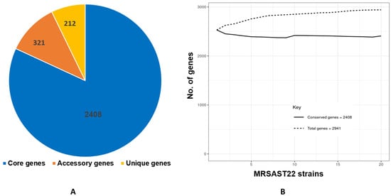 The pan genome of MRSA ST22 strains consists of 2941 genes, of which 2408 (81.8%) genes are part of the core genome, 321 (10.9%) genes are accessory, and 212 (7.2%) genes are unique (Figure 3A). The plot of the pan and core genome shows fluctuation in the number of pan and core genes, which suggests that pan- and core-genome sizes are not stable (Figure 3B).