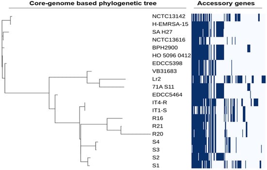 Core-genome SNPs-based tree and heatmap of presence and absence of accessory genes in 20 strains of MRSA ST22.