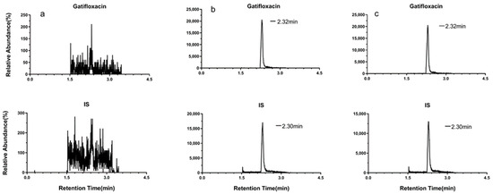 Representative multiple reaction monitoring (MRM) chromatograms of (a) a blank corneal homogenate; (b) a corneal homogenate spiked with 0.4 μg/mL gatifloxacin and the IS; and (c) a corneal sample from the rabbit in group A1.