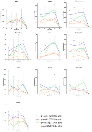 The mean area under curve during the 24 h period (AUC0–24) was significantly higher for GTX-Gel than for GTX-Sol in the ocular tissues (p < 0.05). In all groups, the lowest AUC0–24 was found in the plasma, which indicated that the drug was minimally absorbed into the systemic circulation. The mean plasma AUC0–24 was higher in the GTX-Gel groups than in the GTX-Sol groups, but the difference was not statistically significant (p > 0.05).