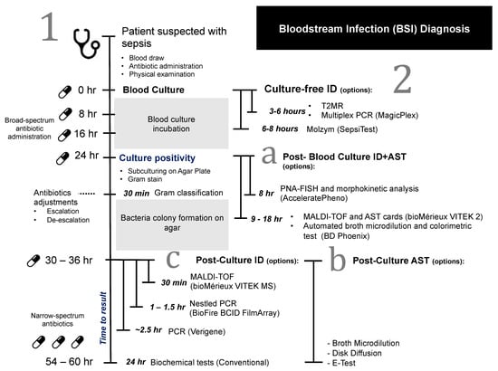 Most of the current ID workflows still rely on a positive blood culture sample. Generally, when a blood culture flags as positive, a further overnight incubation on agar plates (subculture) is performed to obtain pure isolated colonies. Colonies are subjected to Gram stain, followed by a series of biochemical and molecular tests, and/or the matrix-assisted laser desorption ionization time of flight mass spectrometry (MALDI-TOF MS) to confirm the bacterial species. A quantitative measure of antibiotic susceptibility using methods like broth microdilution or ETEST gradient strip (bioMérieux) usually takes place alongside or after ID to give minimum inhibitory concentration (MIC) information of antibiotics against the isolated pathogen. Depending on the growth rate of the microorganisms, it could take anywhere between 24 h and 5 days for blood culture to flag positively. Fully automated systems, such as the (bioMérieux) VITEK 2, are also commonly used for analyzing positive blood cultures, delivering faster AST turnarounds of approximately 9 to 18 h, depending on the organism [,]. Overall ID and AST performed after blood culture can subsequently take days or even weeks to complete (Figure 1) [].