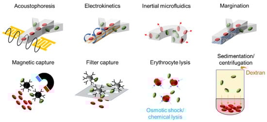 Erythrocyte depletion is an important strategy for pathogen isolation. Negative selection reduces the complexity of the sample and enhances the efficiency of downstream enrichment approaches. For example, after erythrocyte depletion, the sample volume can be reduced by centrifugation or microfluidic techniques [,]. Osmotic shock (e.g., by adding distilled water) is a classical approach for lysing red blood cells. At the same time, most bacteria can survive the osmotic shock due to their rigid cell walls. Saponin and ammonium chloride are common chemical reagents for lysing red blood cells [,,]. Sodium dodecyl sulfate (SDS) and Sepsityper are other examples of chemical lysis [,,]. These lysis buffers and detergents are often applied in positive blood culture samples [,,]. Dextran sedimentation is a physical erythrocyte depletion method, which is used for white blood cell purification [,]. In particular, by mixing a dextran solution with whole blood, red blood cells are depleted during sedimentation by forming rouleaux. The sedimentation process reduces the red blood cells by four orders of magnitude in 20–30 min (>20 mL/h) with over 50% capture efficiency at 10 CFU/mL []. An advantage of dextran sedimentation is that the process does not generate a large amount of cell debris, which can interfere with downstream processes. The removal of blood cells has also been demonstrated using physical filtration. To avoid the clogging of filters, Fang et al. designed a stirring-enhanced filtration device []. The filtration device removes 99.5% of the red blood cells (and all white blood cells) at ~1.2 mL/h and recovers ~70% of bacteria. The filtered samples were further concentrated by magnetic separation using microbeads coated with the flexible region of MBL and detected by PCR.