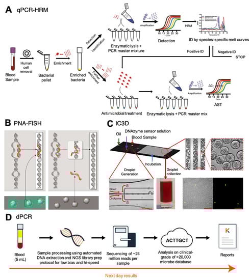 Recent advancements to improve BSI diagnosis. (A) qPCR-HRM workflow from a whole blood sample. (B) HelixBind PNA-FISH technology with a sequence-specific fluorescence dye, (C) Microfluidic-assisted whole blood compartmentalization before DNA amplification and analysis, a trademark of IC3D technology (D) NGS detection workflow directly from whole blood by Karius. Figures were modified and used with permission from (Andini et al., 2018; Blauwkamp et al., 2019; D. K. Kang et al., 2014; Nölling et al., 2016).