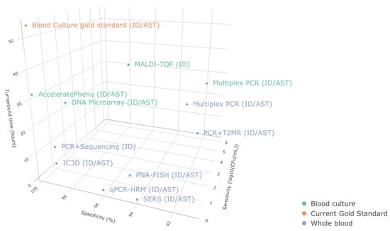Performance characteristics of current and emerging technologies. Sensitivity, specificity, and turnaround time compared against the current gold standard. 1. qPCR-HRM, 2. SERS, 3. IC3D, 4. PNA-FISH 5. PCR+T2MR, 6. Multiplex PCR from whole blood, 7. PCR + sequencing, 8. Multiplex PCR from blood culture, 9. DNA Microarray, 10. MALDI-TOF, 11. AcceleratePheno, and 12. Blood culture gold standard.