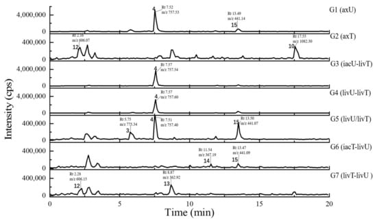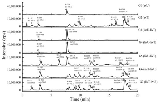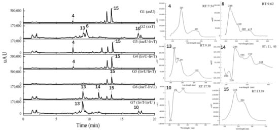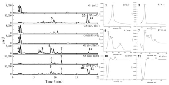 The HPLC traces of the culture extracts detected under the UV wavelength of 360–370 nm and the UV spectra for the featured peaks. The samples include axU (G1), axT (G2), iacU-livT (G3), livU-livT (G4), livU/livT (G5), iacT-livU (G6), and livT-livU (G7). The numbers marked on the peaks or in the UV spectra are numbers for the peaks with remarkable yield changes detected by mass spectrometry and are consistent with the peak numbers in Table 2.