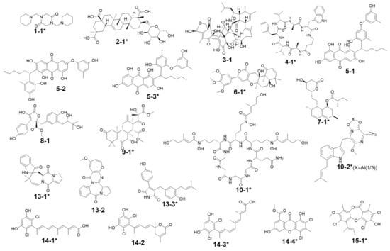 Annotated compound structures for the peaks 1–15. The asterisks (*) mark hits from databases with relatively higher reliability based on their similarities, including not only molecular weights, but also at least one of the following characteristics like GNPS MS2 similarity, UV features, isotopic patterns (for chlorinated compounds), and taxonomy, to the featured peaks. Compounds 10-1 and 10-2 represent two alternative annotations for peak 10 (see Table 3 for further data on each of these annotations). This terminology also applies for the other base compound numbers.