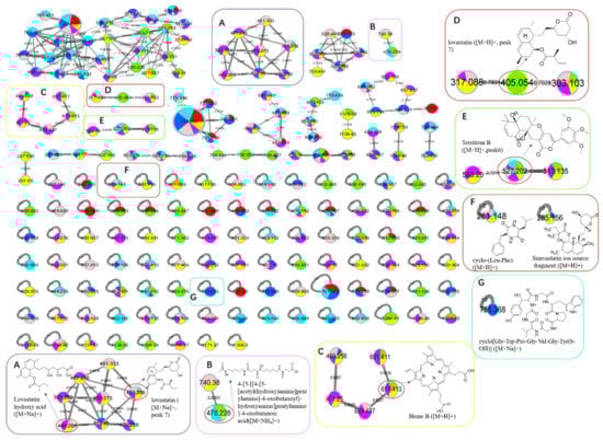 The GNPS molecular network based on positive ion MS/MS spectral similarity, showing a selection of amplified clusters. The nodes display the measured average masses of the molecular ions with identical MS/MS spectra. The sizes of the nodes reflect the relative amount of the corresponding compounds. The different colors of sections in the nodes represent different samples, i.e.,