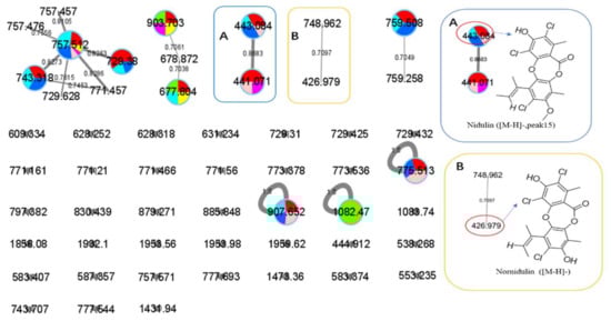 In addition to these 15 peaks observed in the LC-MS profiles, GNPS also annotated several other metabolites by MS/MS similarity comparisons as shown in Figure 9 and Figure 10. Some of these also varied in production levels in the different culture experiments, such as a siderophore-like desferrioxamine with m/z 478.228 together with its congener showing up in axenic A. terreus (G2) and other cultures in cluster F. Additionally, an open-ring di-chlorinated depsidone with m/z value 426.979 was produced in extremely low yield (Figure 10). However, classical GNPS networking can potentially sum the intensity of ions into the same node that possess ‘identical’ m/z values and MS/MS profiles but quite different retention times (e.g., isomers). Therefore, this quantification is not as reliable as EIC integration of the original LC-MS profiles.