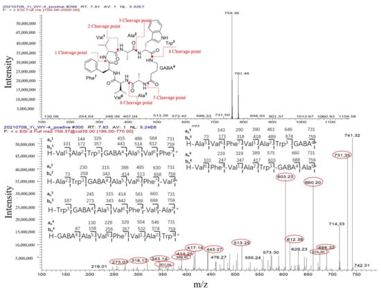 The interpretation of MS/MS spectrum of peak 4 (cyclopeptide unguisin A).