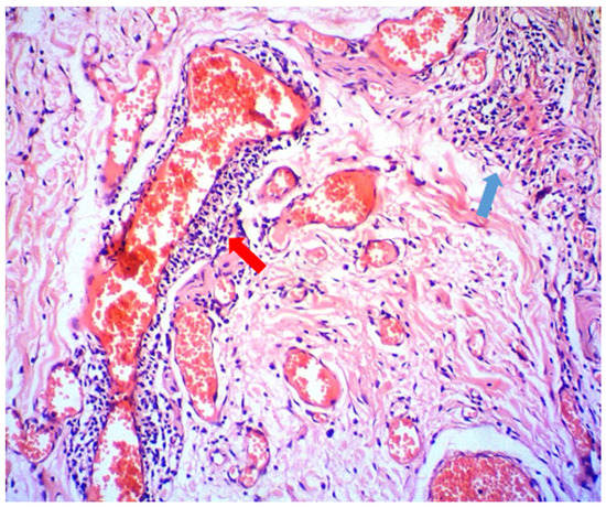 Additional diagnostic tests were performed to exclude infectious or another origin of the lesion (HIV, HSV, Candida spp., Streptococcus spp.). Laboratory data on haemoglobin, blood cells count, liver and kidney function were within normal limits. The levels of the C1-inhibitor and C4 complement factors were normal and ruled out angioedema. The interferon-gamma release assay—IGRA (QuantiFERON-TB gold test) and the intradermal tuberculin test (TST) were positive, but the chest radiography was normal. Histopathological examination of the upper lip tissue biopsy revealed dilation of lymph vessels and a sparse perivascular lymphoplasmacytic infiltrate (Figure 2, red arrow) admixed with a few histiocytes, some of which tend to form small tuberculoid granulomas. (Figure 2, blue arrow). Both histochemical studies for MBT (Modified Acid-fast Stain) and fungi (PAS) were negative. The sputum was also found negative for the MBT.