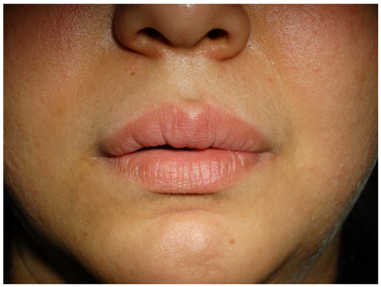 A 29-year-old female without underlying co-morbidities presented with indolent, slow-progressive upper lip swelling for five months. Other local or systemic symptoms did not accompany it. The primary diagnosis established by the dermatologist was allergic cheilitis (the patient was working in a cosmetic studio), but the swelling did not subside with antihistamines. The local examination revealed a significantly enlarged upper lip with erythematous colour and tenderness on palpation. The lip contour and the philtrum were deformed (Figure 1). The nasal mucosa, the floor of the mouth, throat, and tongue were normal. There was no facial nerve palsy or fissured tongue to support Melkersson–Rosenthal syndrome. A provisional diagnosis of Miescher granulomatous cheilitis was made.