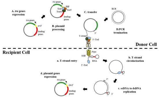 To splice the donor strain, the transfer gene first needs to be expressed and aggregated in the transposable zone of the plasmid. Plasmids encode all of the type IV secretion system (T4SS)-binding-related protein factors required for pair formation as well as the relaxation component required prior to transfer. Prior to DNA transfer, protein complexes (relaxosomes) begin to assemble and carry out activities. Other Tra proteins form the relaxosome (TraI, TraM and TraY), which binds to the integrated host factor (IHF) on oriT and is transferred via the cleavage reaction of TraI relaxase. The TraI relaxase protein catalyses the nicking reaction, leading to a relaxation of plasmid dsDNA. After the nicking reaction, cyclic ssDNA in the donor is turned into dsDNA by rolling circle replication (RCR), at which point the linearized T-stranded DNA combined with TraI at the 5’ end enters the recipient cell via the conjugated pore. Briefly, the interaction of relaxosome with the type IV coupling protein (T4CP) initiates the transfer of the protein.