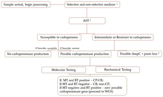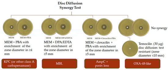 This method requires the use of meropenem discs and meropenem discs supplemented with different inhibitors to detect and identify carbapenemases (Figure 1) [].