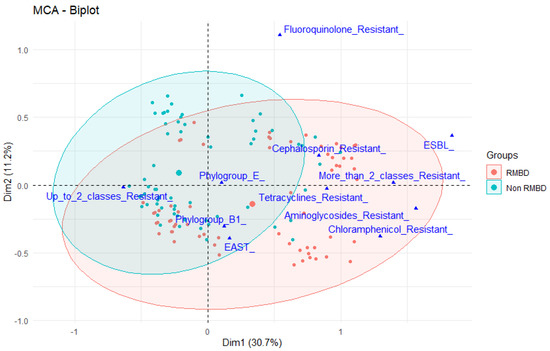 Multiple correspondence analysis (MCA) of categorical variables of E. coli from dogs fed raw meat-based diets (RMBDs) (red) or conventional dry feed (blue). This two-dimensional biplot graphic explains 41.9% of total variation and comprises 95% of E. coli isolates within the ellipse. Variables were considered to be associated when they plotted closely together.