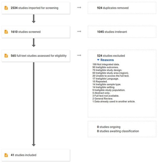 Based on the eligibility criteria, a total of 2534 publications were identified. After removing duplicates, we screened 1610 abstracts of which 565 were eligible for full-text screening. Out of 565 articles, 41 studies met the inclusion criteria for this meta-analysis (Figure 1). In total, 31 studies used a cross-sectional study design, and 10 studies used routine data (Supplementary Table S2).