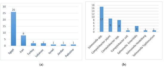 Of the included studies, 26 (63.41%) were conducted in Egypt, 8 in Iran (19.51%), 2 in Turkey (4.88%), 2 in Lebanon (4.88%), 1 in Israel (2.44%), 1 in Jordan (2.44%), and 1 in Palestine (2.44%) (Figure 2a). Of these, 17 reports (42%) included data about Salmonella spp. (the number of reports used for Salmonella spp is the same as that used for NTS), and 8 reports (20%) had data about Campylobacter spp. In addition, some articles focused on one of Salmonella and Campylobacter serovars; Campylobacter jejuni (nine reports, 22%), Campylobacter coli (one report, 2%), Salmonella Enteritidis (four reports, 10%), Salmonella Typhimurium (one report, 2%), and Salmonella Heidelberg (one report, 2%) (Figure 2b) and (Supplementary Table S3).