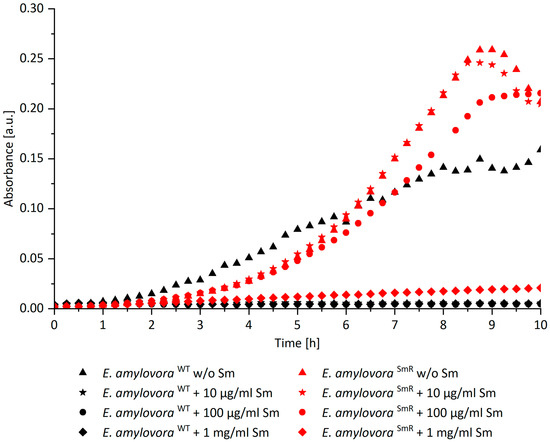 Growth curves of E. amylovora SmR (red) and E. amylovora WT (black) in MPM broth supplemented with different concentrations of Sm. The graph shows light absorbance at 600 nm corrected by blank (MPM) over 10 h. The growth of E. amylovora SmR was unaffected in MPM with an Sm concentration of maximal 100 µg/mL. E. amylovora WT showed no growth at any concentration of Sm.