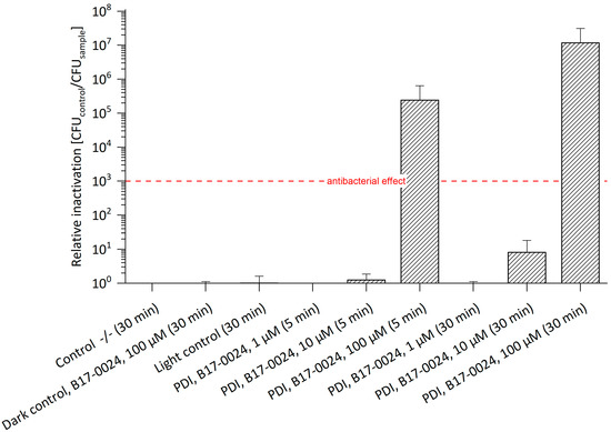 For testing the potential of PDI, a first set of experiments against E. amylovora SmR was performed with B17-0024. Photo-activation of 100 µM B17-0024 resulted in an antibacterial effect against E. amylovora SmR with a relative inactivation of 2.4 × 105 with 5 min incubation and of 1.2 × 107 with 30 min incubation (Figure 2, Table S1). Compared to E. amylovora WT, 100 µM B17-0024 led to an antibacterial effect of four log steps after 5 min, and of six log steps after 30 min incubation. B17-0024 in concentrations of 1 µM and 10 µM did not result in a photo-bactericidal effect irrespective of the incubation period. Again, this is in line with previous studies [12].