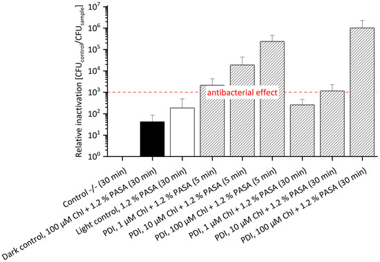 In complement, Chl with 1.2% PASA against E. amylovora SmR supplemented with 100 µM Sm was also tested in this experimental setting. An antibacterial effect was determined in almost all treatments (Figure 5, Table S4). Only the effect of 1 µM Chl with 1.2% PASA and 30 min incubation was not antibacterial. The highest antibacterial effect was observed with a relative inactivation of 1.01 × 106 at 100 µM and 30 min incubation. It is remarkable that the relative inactivation at a concentration of 1 µM as well as 10 µM Chl combined with 1.2% PASA decreased with increasing incubation period, indicative of decay of the photoactive compound during incubation: at a concentration of 10 µM, the relative inactivation was 1.87 × 104 after 5 min and 1.15 × 103 after 30 min; at a concentration of 1 µM, the relative inactivation of 2.14 × 103 decreased to 2.56 × 102. Hence, photo-activation of Chl at lower concentrations led to a reduced efficacy of around 2 log steps with increased incubation period. This effect was not observed at high concentrations (100 µM). Chl is rather unstable and therefore undergoes degradation in the dark [38], which is more relevant at lower concentrations. The dark control contained Chl at 100 µM and 1.2% PASA and showed a value of relative inactivation of 4.20 × 101 after 30 min incubation. The light control containing only 1.2% PASA showed a relative inactivation of 1.86 × 102 after 30 min incubation, which is comparable to that of the treated sample of 1 µM Chl and 1.2% PASA and 30 min incubation. As already described above, the presence of Sm might have a slight additional effect.