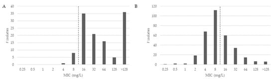 As shown in Figure 1, the CZA MICs of MBL-positive isolates (Figure 1A) were higher compared to MICs of MBL-negative isolates (Figure 1B). The CZA MIC90 was determined at 128 mg/L and the CZA MIC50 at 16 mg/L. Overall, 213 of all MEM-resistant P. aeruginosa isolates were categorized as susceptible (47.5%) to CZA. For the group of MBL-positive isolates, the CZA MIC90 was >128 mg/L and MIC50 was at 32 mg/L. Of all MBL-positive P. aeruginosa isolates, nine isolates carrying the VIM gene were categorized as susceptible (7.4%) to CZA. In the 326 MBL-negative isolates, the MIC90 of CZA was 32 mg/L and the MIC50 was at 8 mg/L. Further, 204 of all MBL-negative P. aeruginosa isolates were categorized as susceptible (62.6%) to CZA.