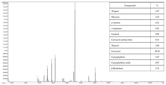 - Simirgiotis, M.J.; Burton, D.; Parra, F.; López, J.; Muñoz, P.; Escobar, H.; Parra, C. Antioxidant and antibacterial capacities of origanum vulgare l. Essential oil from the arid andean region of chile and its chemical characterization by gc-ms. Metabolites 2020, 10, 414. [Google Scholar] [CrossRef]