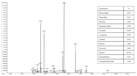 | Thyme essential oil | 201.52 ± 1.67 a | 58.44 ± 0.83 a |