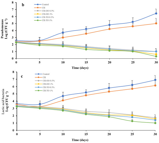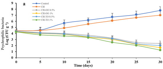 2.4. Impact of CH Films Containing OO and TO on Background Microflora of Beef Meat (In Vivo)