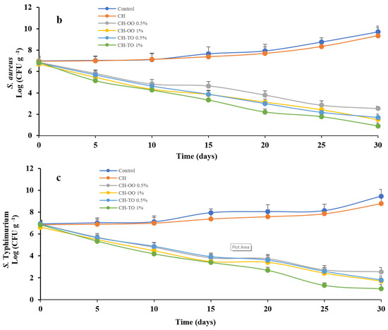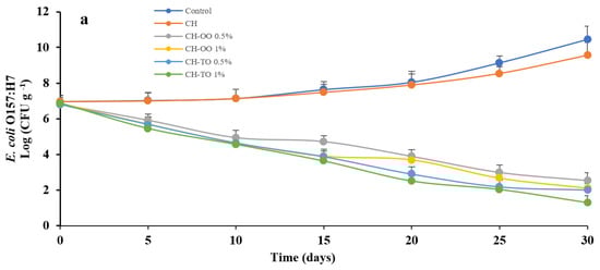2.5. Impact of CH Films Incorporating OO and TO on Foodborne Pathogens of Beef Meat (In Vivo)