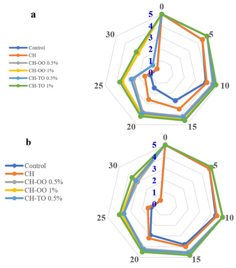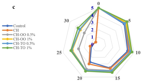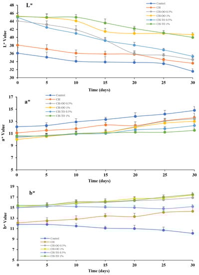 2.6. Impact of CH Films Incorporating OO and TO on Meat Color during Storage Time