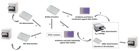 Experimental design for the study of antibiotics and potential antibiofilm agents (PAAs), individually and in combination, against Mycobacterium avium-intracellulare complex (MAC) producing biofilm. 1. Determination of minimum inhibitory concentration (MIC) with the Vizion System; 2. determination of fractional inhibitory concentration index (FICI) with the Vizion System; 3. biofilm formation; 4–6. determination of minimum biofilm inhibitory concentration (MBIC) and minimum biofilm eradication concentration (MBEC) using the crystal violet assay and subculture, respectively.