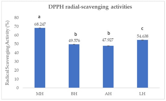 The antioxidant activity (p < 0.05) was found to be between 47.927 and 68.247%, as shown in Figure 3.