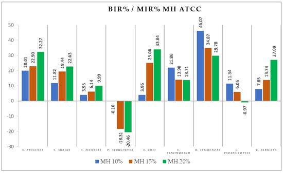 Comparing the BIR percentages, the most sensitive ATCC strains in the case of the MH samples were H. influenzae, E. coli, and S. pyogenes (Figure 4). For H. influenzae, the bacterial inhibition rate (BIR%), depending on the concentration tested (MH 10%, MH 15%, and MH 20%), varied from 29.78% to 46.07% (Figure 4). In the case of E. coli, MH proved a bacterial inhibition rate (BIR%) ranging from 3.96% to 33.84% compared to the negative control, and against S. pyogenes, BIR ranged from 20.01% up to 32.27%. MH showed a medium effect on S. aureus, S. typhimurium, and C. albicans, with values up to 20% inhibition at the highest concentration tested and low inhibitory effects against S. flexneri and C. parapsilopsis with inhibitory values ranging up to 11%.