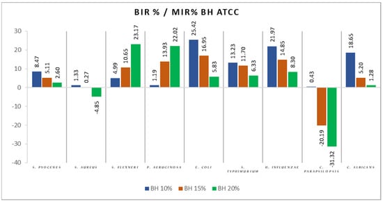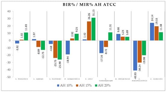 S. pyogenes, P. aeruginosa, and S. typhimurium proved less sensitive to the effect of AH, starting with negative values for AH 10% and slowly increasing values reaching BIR values ranging from 9.25% to 11.31% for AH 20%.