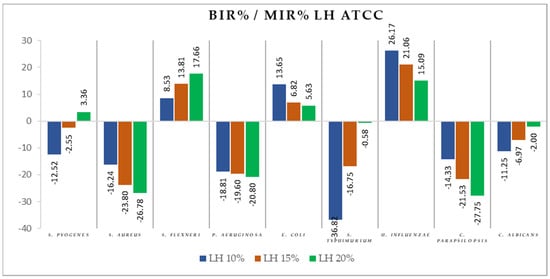 Concerning the three LH concentrations tested (LH 10%, LH 15%, and LH 20%), the results presented in Figure 7 show the best antimicrobial effect recorded against S. flexneri (with BIR ranging from 8.53% to 17.66%). For E. coli and H. influenzae, the effect was contrary to the concentration increase, with decreasing BIR values ranging from 26.17% to 5.63%. S. pyogenes, S. typhimurium, and C. albicans proved less sensitive to LH, with BIR%/MIR% values that showed small inhibitory activity due to insufficient concentration.