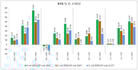 Concerning the inhibition of the clinical E. coli isolates, we found a positive correlation of the antimicrobial effect with the concentration, as seen in Figure 8. Of all the honey samples tested on the E. coli strains (E. coli (BIDLMV code 2023), E. coli (BIDLMV code 2067), E. coli (BIDLMV code 21117)), MH was the most active, with BIR ranging from 49.2% up to 74.9% in the case of MH 20%. The other types of honey showed similar efficacy values, with the concentration of 10% being too low to determine inhibition in most cases.