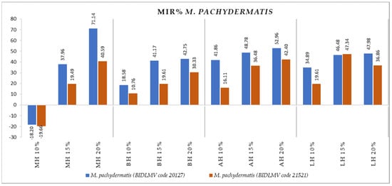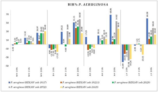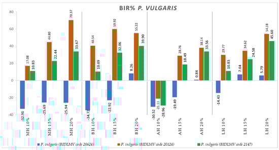 BIR% for P. vulgaris, presented in Figure 10, showed that P. vulgaris (BIDLMV code 20624) proved resistant to MH at all concentrations tested, with negative values ranging from −32.91% to −25.69%. BH also demonstrated no effect on P. vulgaris (BIDLMV code 20624) at 10% and 15%, with positive values only at the 20% concentration tested. AH and LH samples proved effective at 15% and 20%, with inhibitory values ranging from 0.84% to 38.14% for AH 20% and 5.79% to 54.18% for LH 20%.