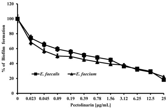 Several antimicrobial compounds also inhibit bacterial biofilm formation because antibiotics kill the bacteria and indirectly decrease biofilm formation []. To test whether the biofilm formation inhibition of pectolinarin was due to the antibacterial activity, E. faecalis and E. faecium were treated with 100 μg/mL of pectolinarin for 24 h. Pectolinarin, despite its notable inhibition of biofilm formation, did not show any effect on the bacterial growth (Figure 5).
