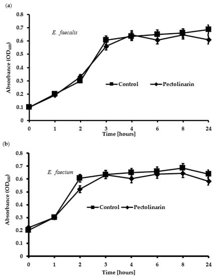 Growth curves were obtained as previously described with slight modification []. E. faecalis and E. faecium cultures were prepared with tryptic soy broth at an OD600 = 0.1. Pectolinarin (100 μg/mL) was added and then the cells were incubated at 37 °C. Growth was evaluated by measuring the optical density of OD600 using a microplate reader after 0, 1, 2, 4, 8, 12, 24, and 72 h [].