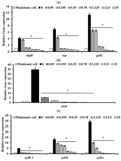 To understand the molecular basis of pectolinarin inhibition of biofilm formation, the expression of genes related to biofilm-associated factors, Cytolysin and QS system, was tested by qRT-PCR. After treatment with 0.01 to 25 μg/mL of pectolinarin, the expressions of biofilm-associated factors including ebpB (IC50 = 0.09 μg/mL), esp (IC50 = 0.01 μg/mL), and gelE (IC50 = 0.01 μg/mL) in E. faecalis and acm (IC50 = 0.01 μg/mL), bps (IC50 = 0.01 μg/mL), ebpA (IC50 = 0.01 μg/mL), esp (IC50 = 0.09 μg/mL), gelE (IC50 = 0.09 μg/mL), and scm (IC50 = 0.01 μg/mL) in E. faecium were significantly decreased (Figure 6a and Figure 7a, respectively). The expressions of fsrB (IC50 = 0.01 and 0.09 μg/mL) and fsrC (IC50 = 0.01 μg/mL) genes comprising the Fsr quorum-sensing system were reduced by treatment of pectolinarin (Figure 6b and Figure 7b). The treatment of pectolinarin also dose-dependently reduced the expression of genes related with Enterococcal cytolysin synthesis including cylR2 (IC50 = 0.09 μg/mL), cylM (IC50 = 0.09 μg/mL), and cylLS (IC50 = 0.09 μg/mL) (Figure 6c).
