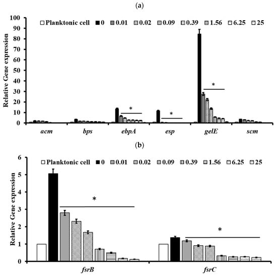 Bacterial cultures and the pectolinarin treatment condition was the same as the method to check the biofilm formation inhibition. Total RNA was isolated using TRIzol reagent (Life Technology, Thermo Fisher Scientific, MA, USA) according to the manufacturer’s instructions, and the reverse transcriptase (NanoHelix, Daejeon, Korea) reaction was prepared using 1 µg of RNA to obtain cDNA. qRT-PCR was carried out using the 2X Sybr Green qPCR Mater Mix (CellSafe, Yongin, Korea). Primer sets for the fsrB, fsrC, gelE, acm, scm, ebpA, ebpB, esp, bps, cylM, cylR2, and cylLS genes are listed in Table 2. Genes encoding 23 sRNA and tufA were used as endogenous controls.
