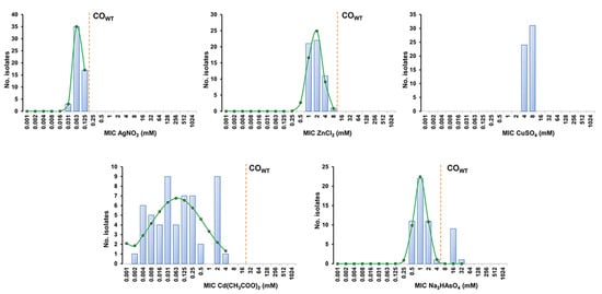 The analyses of the MIC distributions of heavy metals were used to estimate the presence of non-wild-type (NWT) populations towards these compounds, which are characterized by the presence of acquired resistance mechanism(s) with phenotypic expression [56]. On the contrary, a wild-type (WT) population is considered as not presenting such resistance mechanisms [56]. Both populations can be identified using the cut-off (COWT) value, which corresponds to the highest MIC value encountered in the WT population and is expressed as WT ≤ X mM [56]. Consequently, a NWT population is characterized by MICs > COWT.