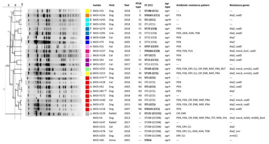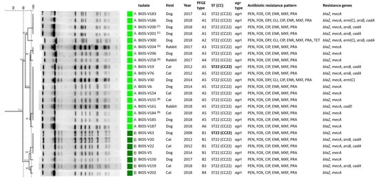 SmaI-PFGE profiles of the S. aureus isolates associated with SSTIs in companion animals and corresponding clonal lineages as determined by MLST and their correlation with host, agr types, phenotypic and genotypic resistance traits. The pairs of isolates recovered from the same animal are marked by (A) to (D), where each letter corresponds to a different animal. The dendrogram was built using Bionumerics and the UPGMA algorithm, using the Dice coefficient, an optimization of 0.5% and a tolerance of band of 1%. The dashed lines correspond to the similarity criteria for considering isolates belonging to the same PFGE type (≥80%) or subtype (≥97%). Isolates sharing the same PFGE type or subtype were considered as belonging to the same sequence type (ST). The isolates subjected to MLST are indicated in bold type. Unk: unknown host; CC: clonal complex; ST: sequence type; PFGE: pulsed-field gel electrophoresis; PEN: penicillin; CXI: cefoxitin; ERY: erythromycin; CLI: clindamycin; CIP: ciprofloxacin; ENR: enrofloxacin; MOX: moxifloxacin; PRA: pradofloxacin; KAN: kanamycin; GEN: gentamycin; TOB: tobramycin; FUS: fusidic acid; BCT: bacitracin.