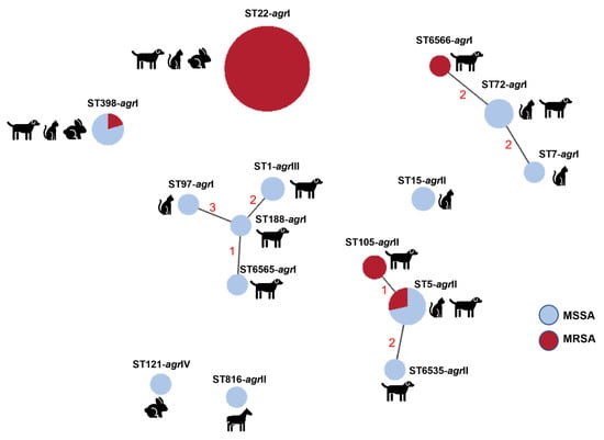 The population structure of our animal-associated S. aureus collection seems to reflect the predominant lineages circulating in the community and human healthcare settings [37,38,39,40], highlighting the potential sharing of S. aureus strains between companion animals and their owners. In fact, several studies have demonstrated a similarity between S. aureus/MRSA clones isolated from companion animals, particularly cats and dogs, with those isolated from close-contact humans [35,41,42].