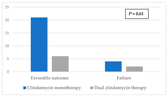 Among the 33 patients treated with clindamycin, 25 (76%) received monotherapy and eight (24%) received dual therapy, with a median treatment duration of 6 weeks (6–12).
