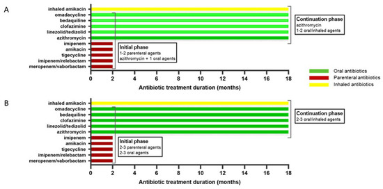Antibiotic schedule for Mycobacterium abscessus complex infection. (A) Macrolide resistant strain. (B) Macrolide susceptible strain.
