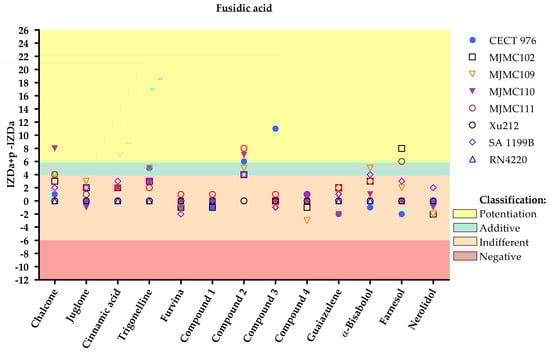 Inhibition zone diameter (IZD) values (mm) and respective classification according to the combined application of the selected phytochemicals and fusidic acid against the eight different S. aureus strains. The effect of dual combinations of antibiotics and phytochemicals was classified as potentiation when IZDa+p–IZDa ≥ 6 mm (yellow zone), additive when 6 mm > IZDa+p–IZDa ≥ 4 mm (green zone), indifferent when 4 mm > IZDa+p–IZDa > −6 mm (light pink zone) and negative when IZDa+p–IZDa ≤ − 6 mm (dark pink zone), where IZD corresponds to the inhibition zone diameter, a = antibiotic and p = phytochemical. Compound 2, a nitrovinylfuran derivative, induced total growth inhibition against the RN4220 strain. More detailed information about the interactions is given in the Supplementary Materials, including some geometric shapes that might be overlayed on the graph (Supplementary Materials Table S1).