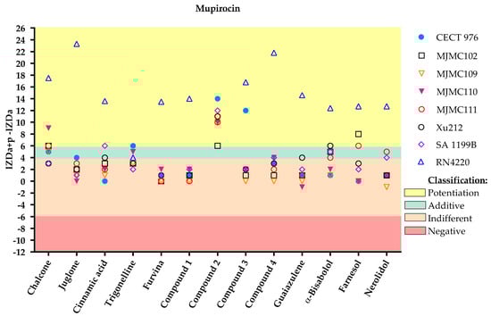 Inhibition zone diameter (IZD) values (mm) and respective classification according to the combined application of the selected phytochemicals and mupirocin against the eight different S. aureus strains. The effect of dual combinations of antibiotics and phytochemicals was classified as potentiation when IZDa+p–IZDa ≥ 6 mm (yellow zone), additive when 6 mm > IZDa+p –IZDa ≥ 4 mm (green zone), indifferent when 4 mm > IZDa+p–IZDa > −6 mm (light pink zone) and negative when IZDa+p–IZDa ≤ −6 mm (dark pink zone), where IZD corresponds to the inhibition zone diameter, a = antibiotic and p = phytochemical. Compound 2, a nitrovinylfuran derivative, induced total growth inhibition against the RN4220 strain. More detailed information about the interactions is given in the Supplementary Materials, including some geometric shapes that might be overlayed on the graph (Table S1).